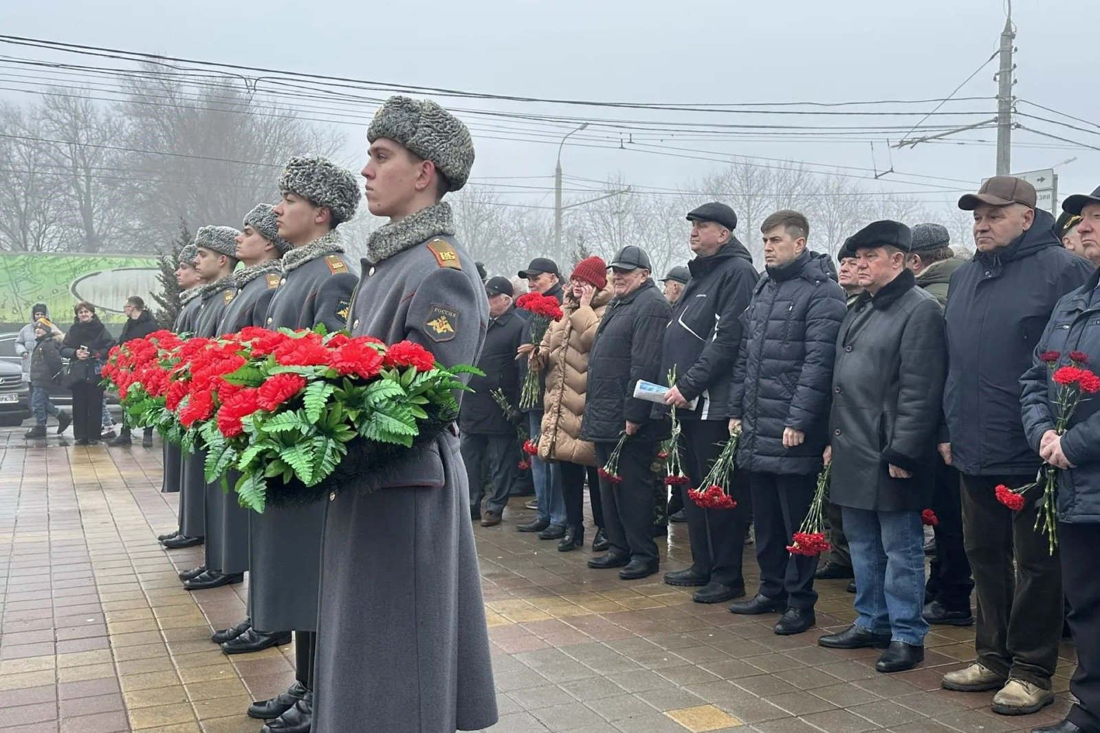 В торжественной церемонии возложения гирлянды Славы и цветов приняли участие также представители правительства, Государственной Думы, Законодательного Собрания области, Донской митрополии, Южного военного округа, администрации Ростова-на-Дону, городского отделения совета ветеранов, Герои России, почетные граждане Ростова-на-Дону.