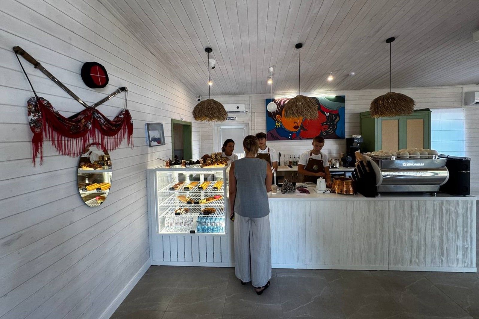 На площадке кофейни «Печка-речка» туристы могут полюбоваться настоящей русской печью, ознакомиться с рекламными буклетами, посмотреть фильмы о достопримечательностях Донского края или поиграть в необычные настольные игры, пока сотрудники готовят традиционный кофе по-казачьи с закуской в виде бутербродов с селедкой.