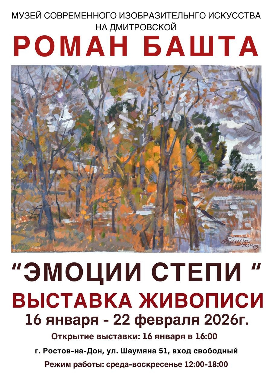 Выставка Романа Башты "Эмоции Степи " предлагает создание уникального пространства для исследования связи искусства и природы, эмоций и ландшафта. Это возможность для зрителей поразмышлять о том, как природа влияет на чувствительность и восприятие каждого, и как художник передаёт свой внутренний мир через образы, созданные в разные времена года. Художник романтизирует Степь, видя в ней живой организм, наделенный разумом, эмоциями и интеллектом. Автор со своим эмоциональным взглядом на вечный ход времени степного ландшафта, столь нам близкого и привычного, приближает нас к теме бесконечности. Сто, тысячу, или десять тысяч лет назад, Степь существовала в пространстве бесконечного Бытия, где художник Роман Башта лишь её восторженный поклонник.