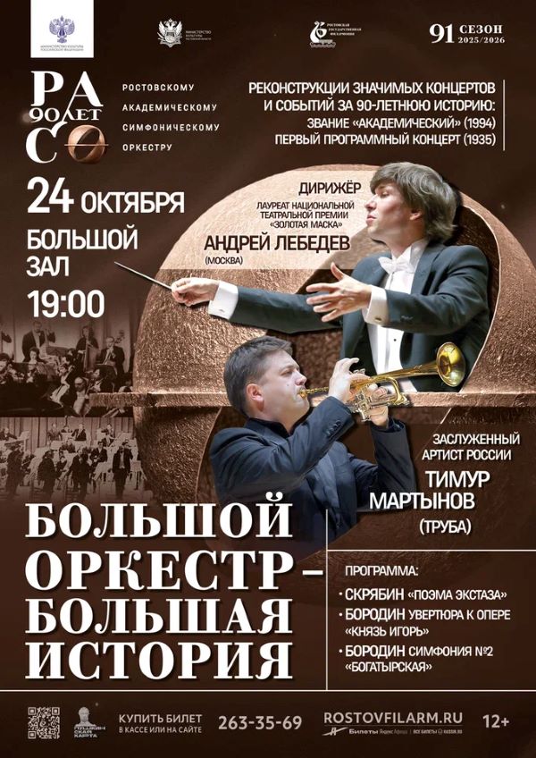 Зарождение. Окунитесь в эпоху становления оркестра. В программе — музыка, с которой все начиналось: от «Поэмы экстаза» Скрябина до симфонии Бородина. Соло на трубе исполнит лауреат XVII Международного конкурса им. П.И. Чайковского Алексей Иванов. Дирижер — обладатель премии «Золотая маска» Андрей Лебедев.