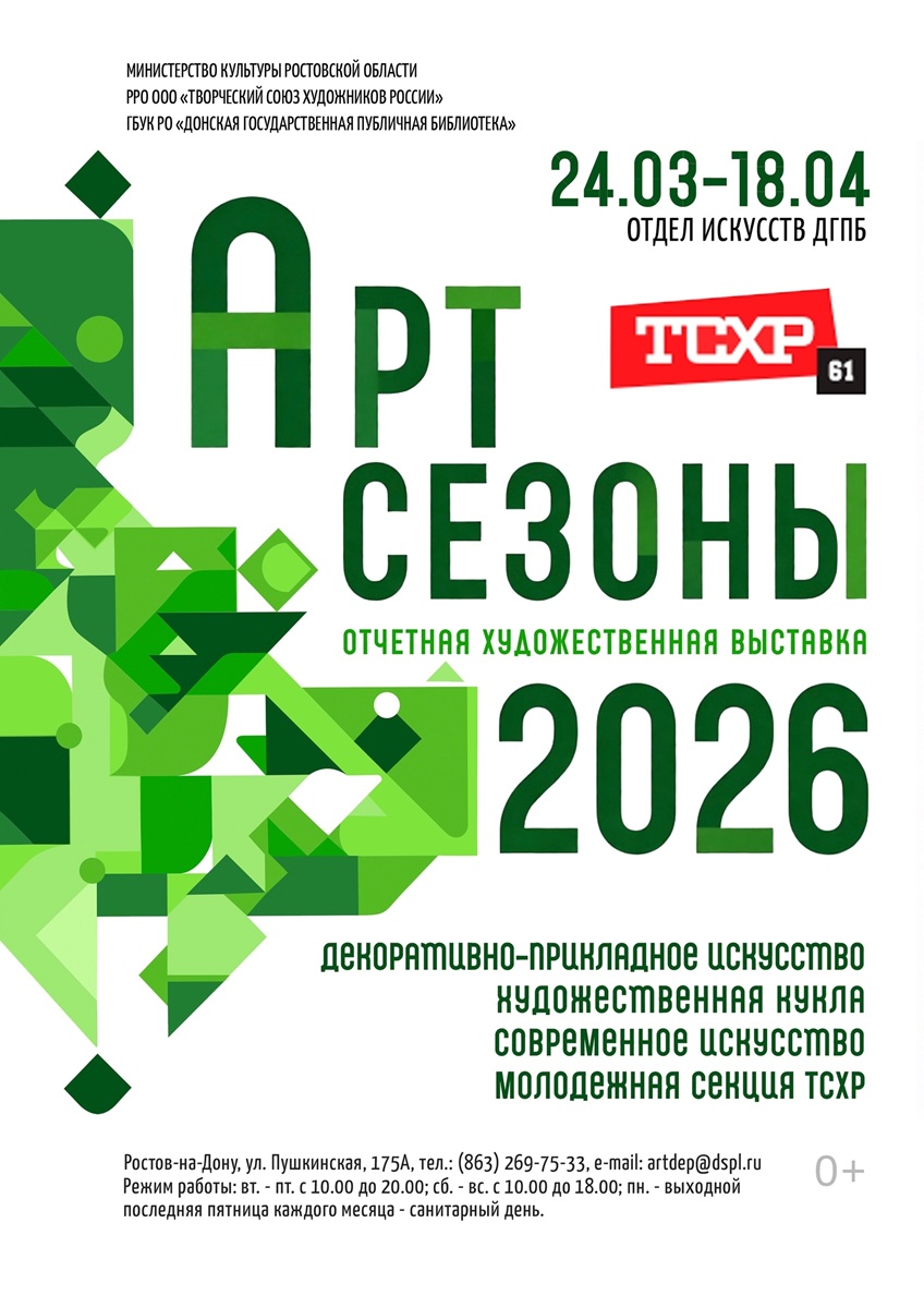 Выставка будет работать до 18 апреля по адресу: г. Ростов-на-Дону, ул. Пушкинская, 175а (Отдел искусств). Режим работы: вторник – воскресенье с 10:00 до 18:00, понедельник — выходной день.
