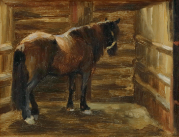 Великолепный образ коня в деннике «Жеребец в конюшне» написан с профессиональным знаточеством натуры. Метод изображения отмечен вниманием к эстетической ценности живописи и восходит к авторству Петра Покаржевского, известного педагога, художника-баталиста, учив¬шего изображать лошадей студентов в МГХИ им. В. И. Сурикова, среди которых был и ставший первым народным художником РСФСР на Дону Борис Тихонович Спорыхин. Картина была создана на Терском конезаводе в Пятигорье, где работали на летней практике студенты под руководством профессора Петра Дмитриевича Покаржевского. Статность и благородная красота терского жеребца, стоящего в сумраке конюшни, переданы в пере¬ливах коричневато-умбристой гаммы с мягкой лессировкой в тончайших нюансах светотени.