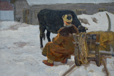 Волков А.В. Корова, запряженная в сани. 1948. Х., м. 53х90 см