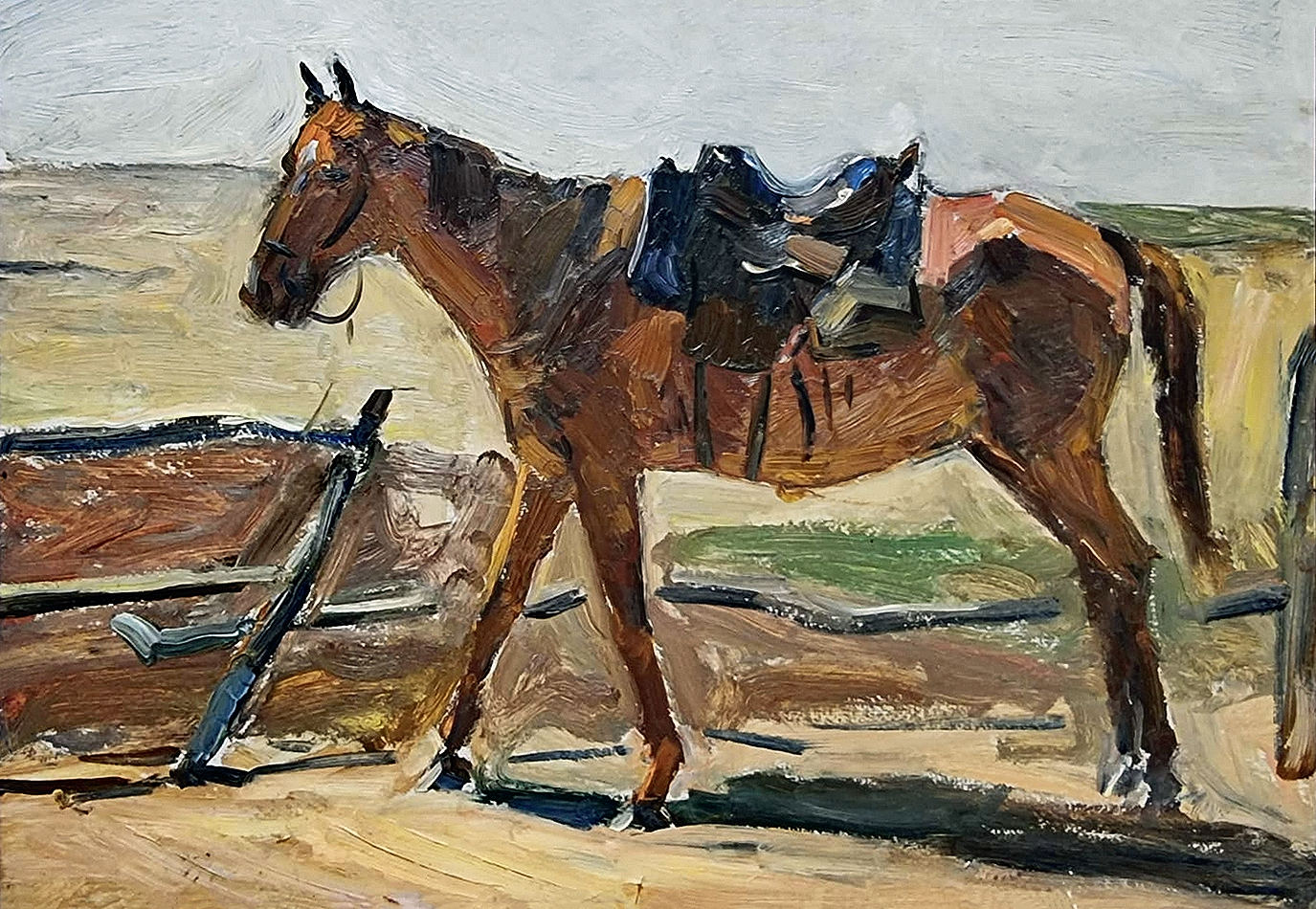 Не менее выразительна фигура коня в картине «Пегий мерин» кисти Народного худож¬ника СССР Тараса Гурьевича Гапоненко, окон¬чившего Bыcший xудoжeствeннo-теxничeский инcтитут в Москве (мастерская H. M. Черны¬шева). Всесоюзную славу и европейскую извест¬ность художнику принесла большая композиция «На обед к матерям» (1935), удостоенная Золотой медали на международной художественной выставке в Париже. Художник посвятил свои лучшие картины теме колхозного труда, живот¬новодству и птицеводству («На птичьем городке» 1959), а также портретам лошадей, коров и коз. Образы животных, представленные на выставке, как и «Пегий мерин», написаны мастером на родной Смоленщине, где прошли детство и юные годы художника.