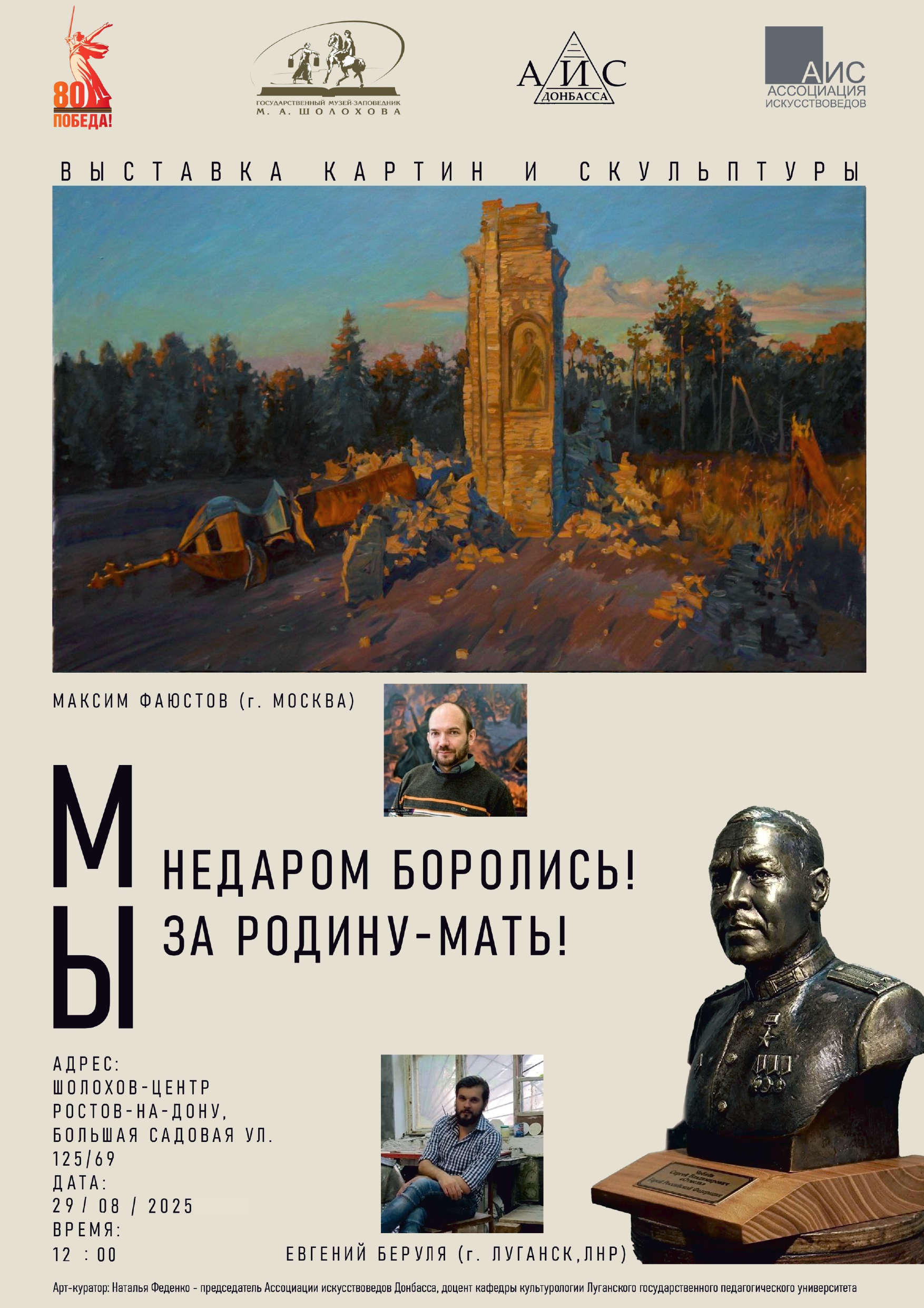 В рамках Года защитника Отечества 29 августа в «Шолохов-Центре» откроется выставка «Мы недаром боролись! Мы за Родину-Мать!». Экспозиция познакомит с работами двух авторов, представляющих разные виды искусства: Евгения Беруля, талантливого молодого скульптора из Луганска, участвующего в СВО, и Максима Фаюстова, известного российского художника, члена Московского союза художников.
