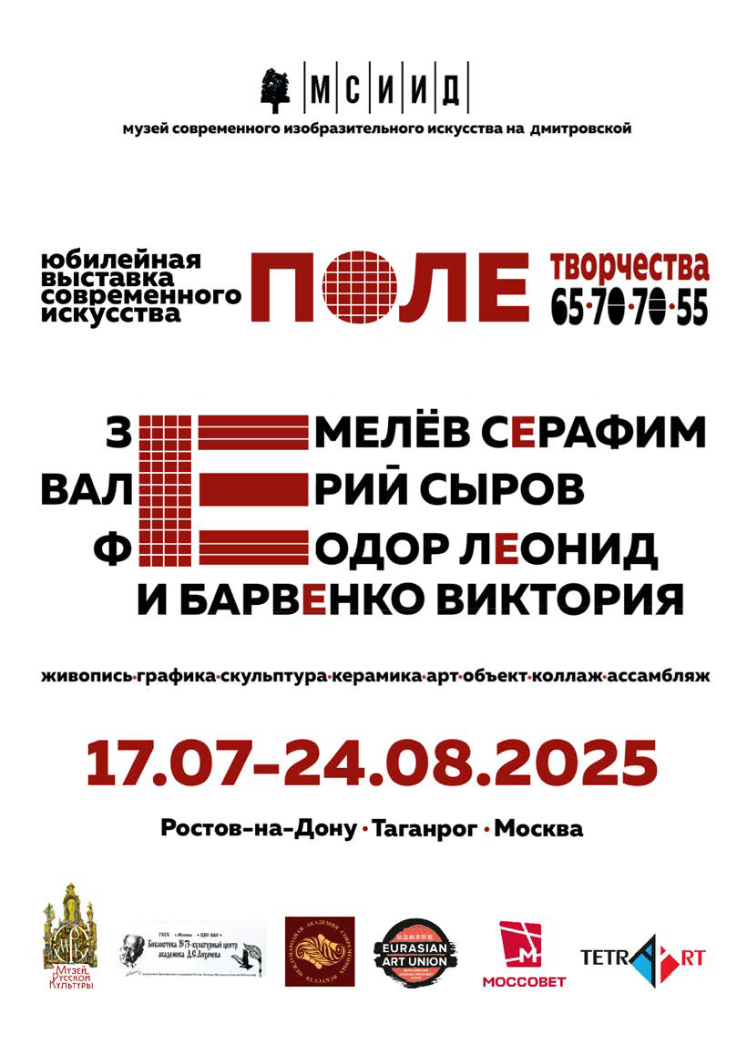 Целостная система перекрестных связей разных эпох, контрасты и параллели цивилизаций рождают многообразный ряд в многослойном по смыслам и метафорам авторском искусстве, представленном на выставке «ПОЛЕ творчества». Это ПОЛЕ космически объединяет художников-пассионариев неповторимых по выбранному пути, они едины в творческой свободе и в соработничестве в международном Евразийском художественном союзе, организованном Леонидом Феодором. Для четырех мастеров, живущих ныне в разных местах силы — от Ростова-на-Дону и Таганрога до Москвы и Подмосковья, важен концептуальный подход в выражении современных коллизий эхом отражающих историю тысячелетий.
