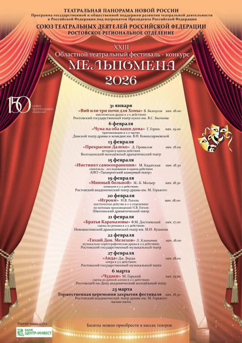 В течение месяца зрителей ждет насыщенная программа. Афиша «Мельпомены» включает 11 постановок ведущих театров Ростовской области. 31 января в Ростовском государственном театре кукол им. В.С.Былкова уже состоялся показ спектакля «Вий, или Три ночи для Хомы». Донской театр драмы и комедии им. В.Ф.Комиссаржевской покажет трагикомедию Григория Горина «Чума на оба ваши дома». Волгодонский молодежный драматический театр представит историю в одном действии «Прекрасное Далеко» Дмитрия Привалова. Таганрогский камерный театр порадует зрителей спектаклем-исследованием «Инстинкт самосохранения» Марии Кадатской.